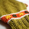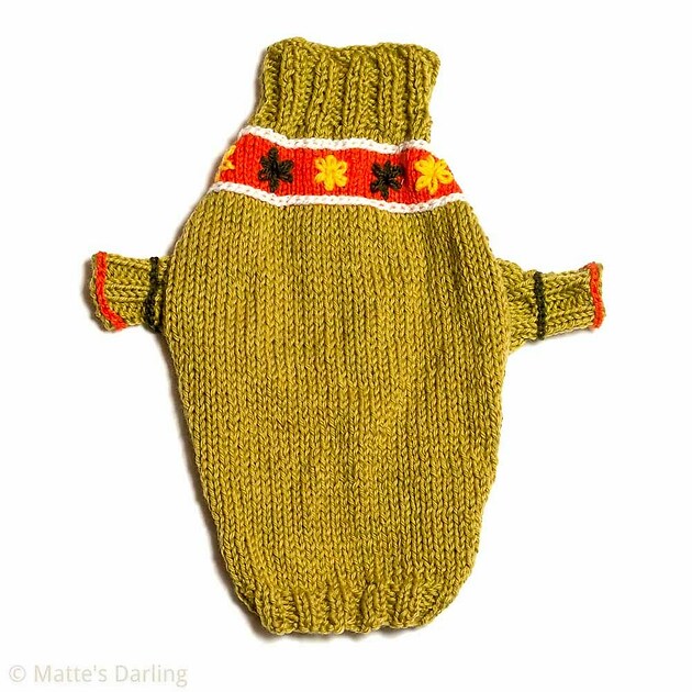 This is a sweater in spring green with a neck line in orange with forest green and bright yellow flowers.