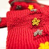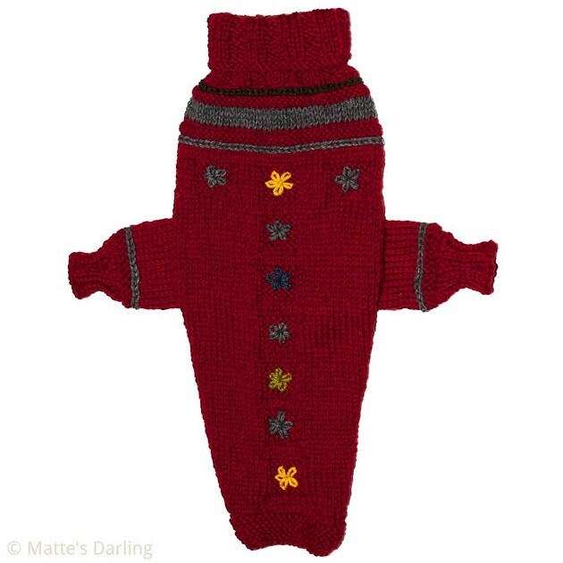 This is a lovely turtle neck sweater, with a lot of intricate purl & straight knitting details. Aside from grey knitted and embroidered areas, it has an eray of different colored little flowers over the shoulders and along the back.