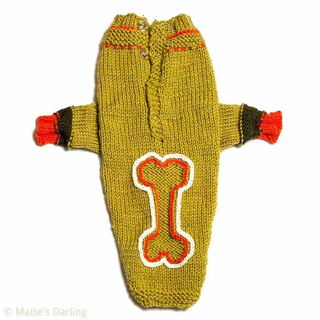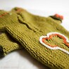 This is a mild, green sweater, with a knitted bone pattern, enhanced with orange and white embroidery, around the edges.