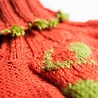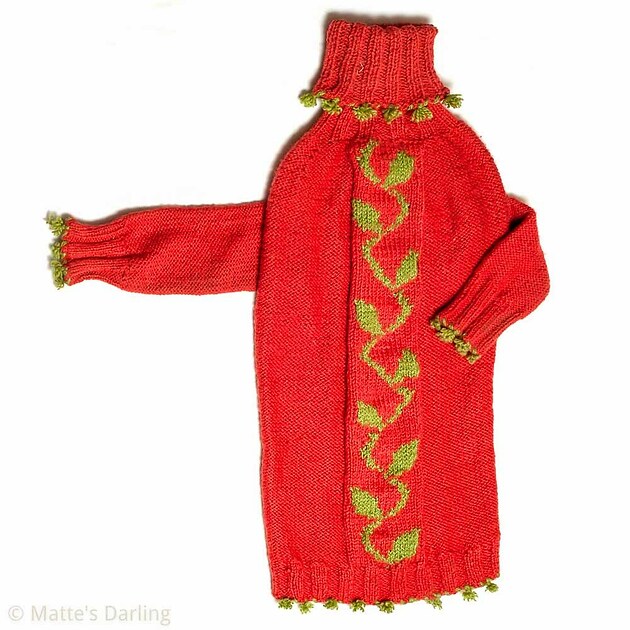 Along the back, a knitting pattern of a bloom rank in green, on a garter knit strip.