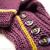 This sweater in a mellow purple, has a purl knit placket with five matching buttons. The edge of the crew neck has an unusual, handmade, fringe in spring green and light grey.There is also an embroidery, at the lower part of the sleeves, in the same colors.