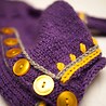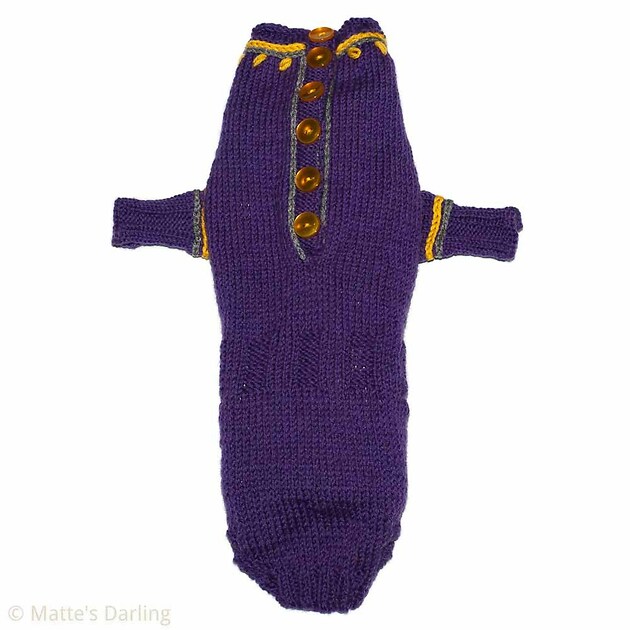 This purple sweater has a round neckline, embroiderd in grey and yellow, so does the sleeves. There is a longer placket on the back, knitted with grey on the reverse, and five buttons. Futher down, there is a rib knit, to enhance the waist.