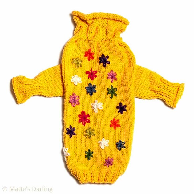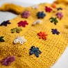 There is an erray of, multi colored, flowers sprinkled, over the back of this sweater; a reminder of a spring to come!